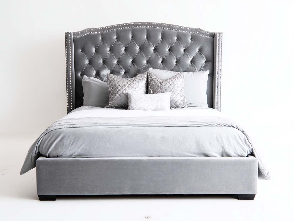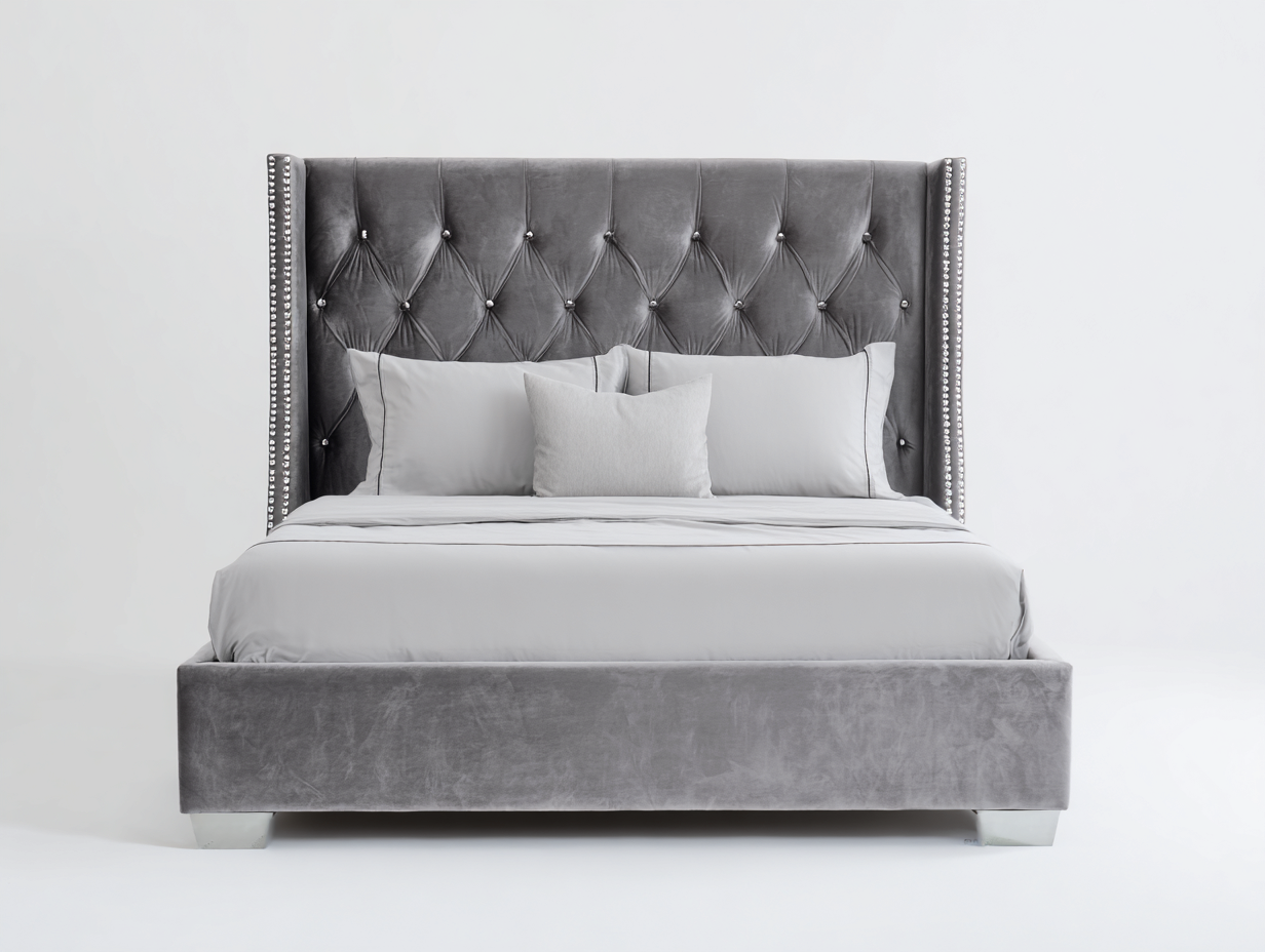 Cama doble tapizada en terciopelo 212x170x138 cm - gris - diseño elegante para dormitorio