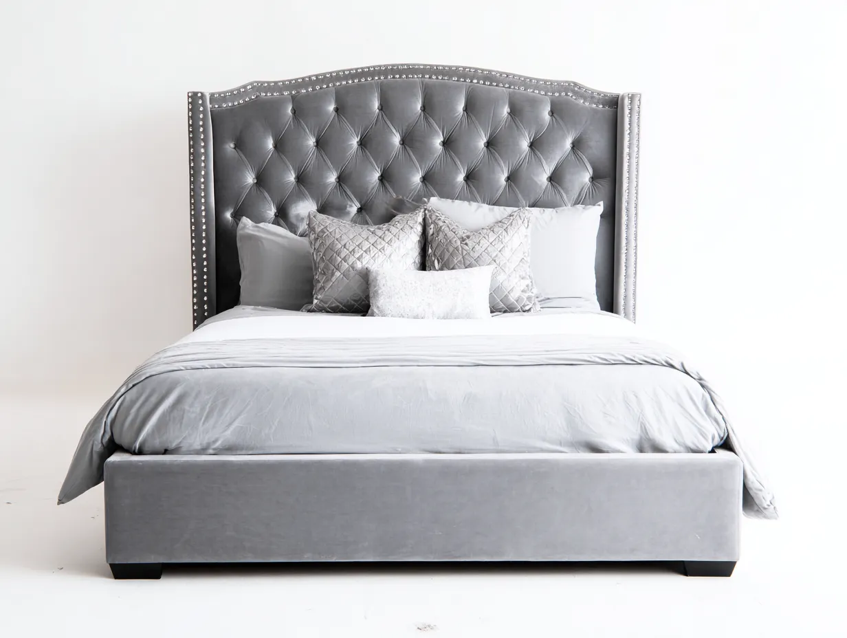 Cama doble tapizada con cabecero alto capitoné 200x160x125 cm - gris claro - estilo elegante para dormitorio